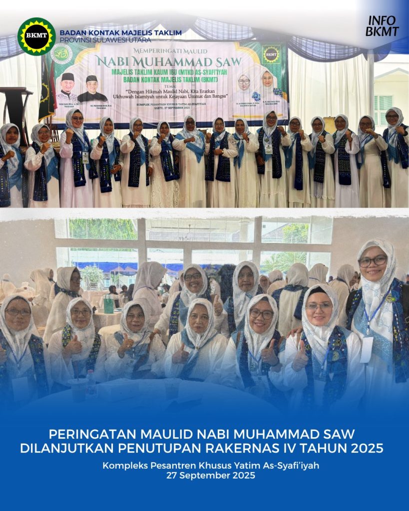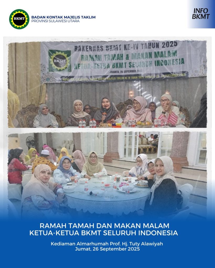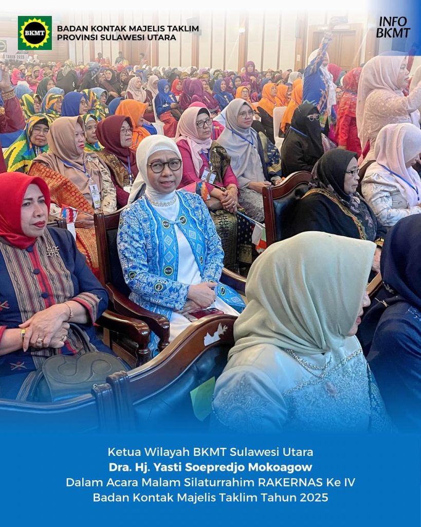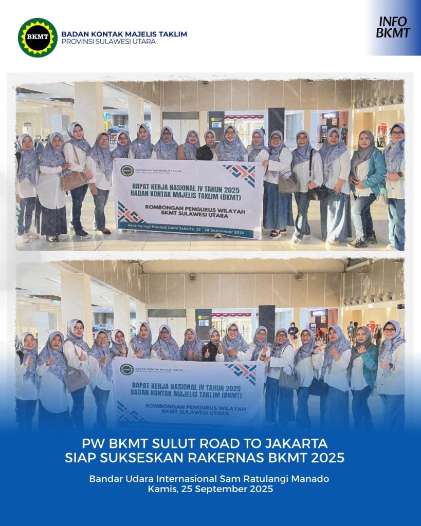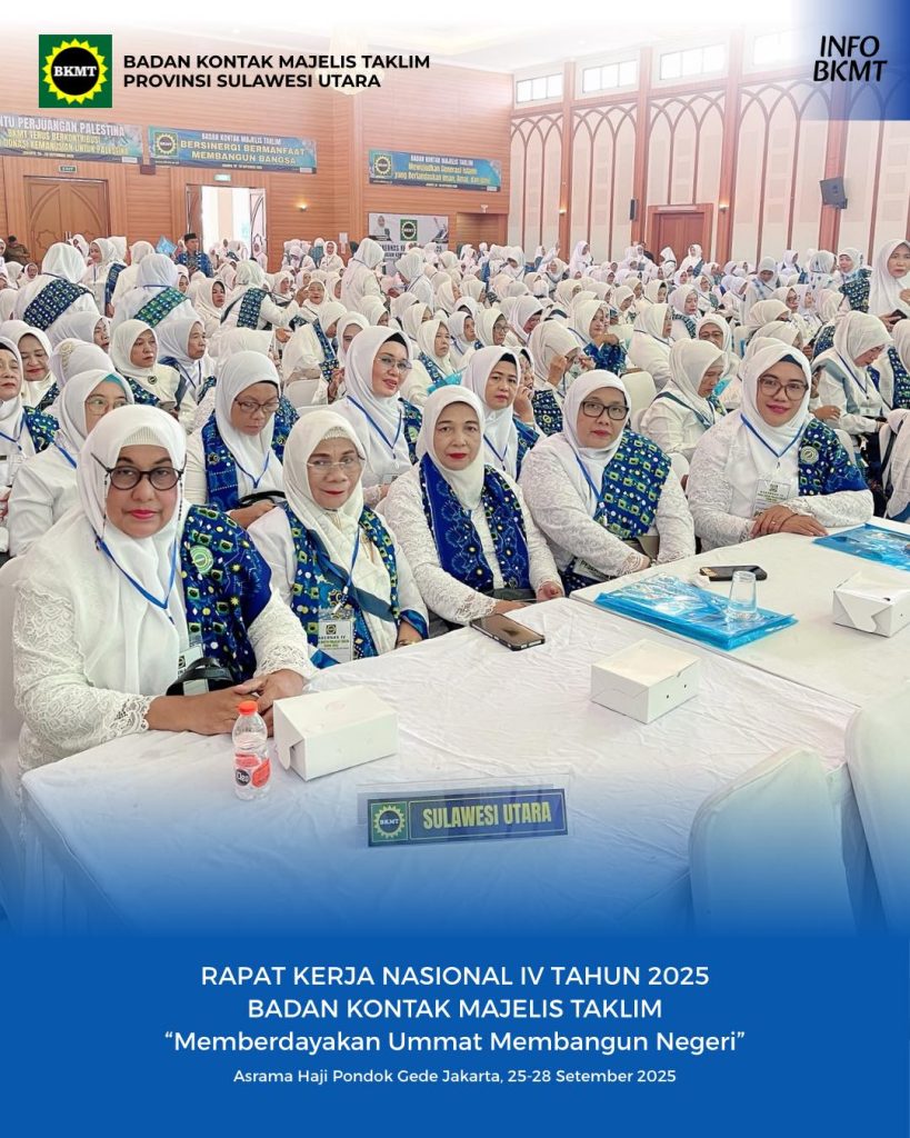Jakarta, 28 September 2025 — Badan Kontak Majelis Taklim (BKMT) Provinsi Sulawesi Utara turut mengambil peran strategis dalam Rapat Kerja Nasional (Rakernas) IV BKMT yang digelar pada 25–28 September 2025 di Asrama Haji Pondok Gede, Jakarta.