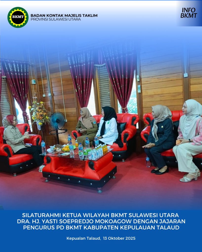 Pada 13 Oktober 2025, Kabupaten Kepulauan Talaud mendapat kehormatan dengan kunjungan Ibu Dra. Hj. Yasti Soepredjo Mokoagow, Ketua Wilayah BKMT Sulawesi Utara, yang juga merupakan anggota Komisi X DPR RI. Meskipun berada dalam jadwal kunjungan kerja yang sangat padat, beliau tetap meluangkan waktu untuk bersilaturahmi dengan pengurus dan anggota BKMT daerah Talaud.